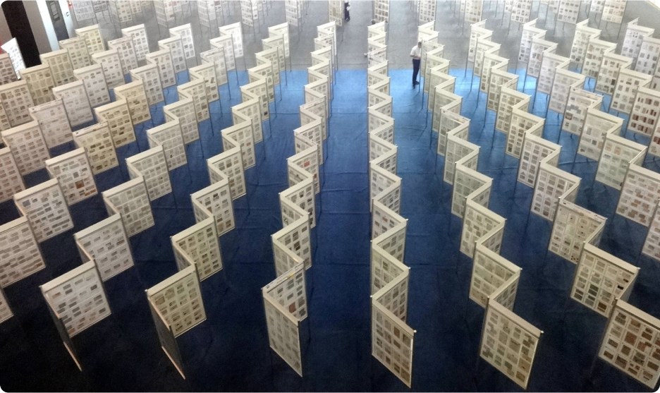 • Sobre um círculo azul, simbolizando o mundo, reina a literatura filatélica representada por uma pena escrevendo um livro;